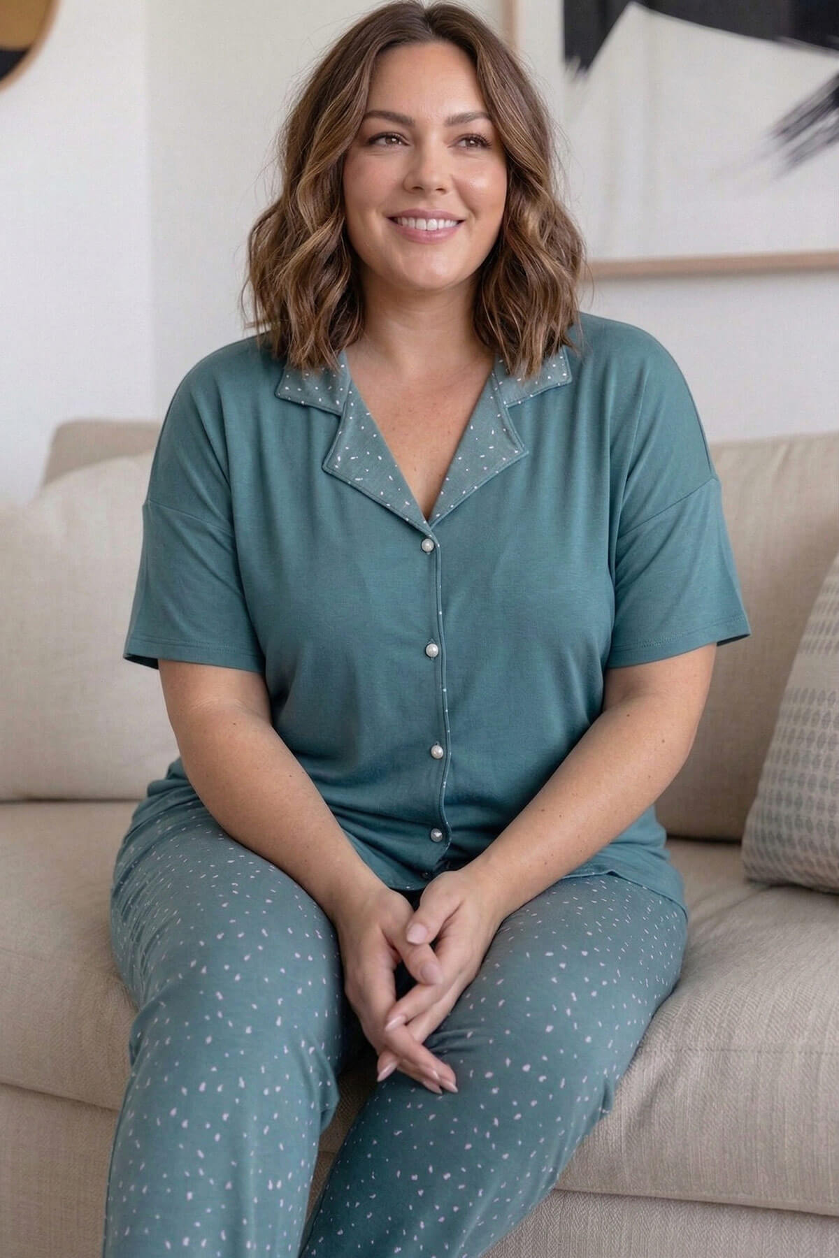 | Mint Konfeti Desenli Büyük Beden Kısa Kollu Önden Düğmeli Bambu Kadın Pijama Takımı | |