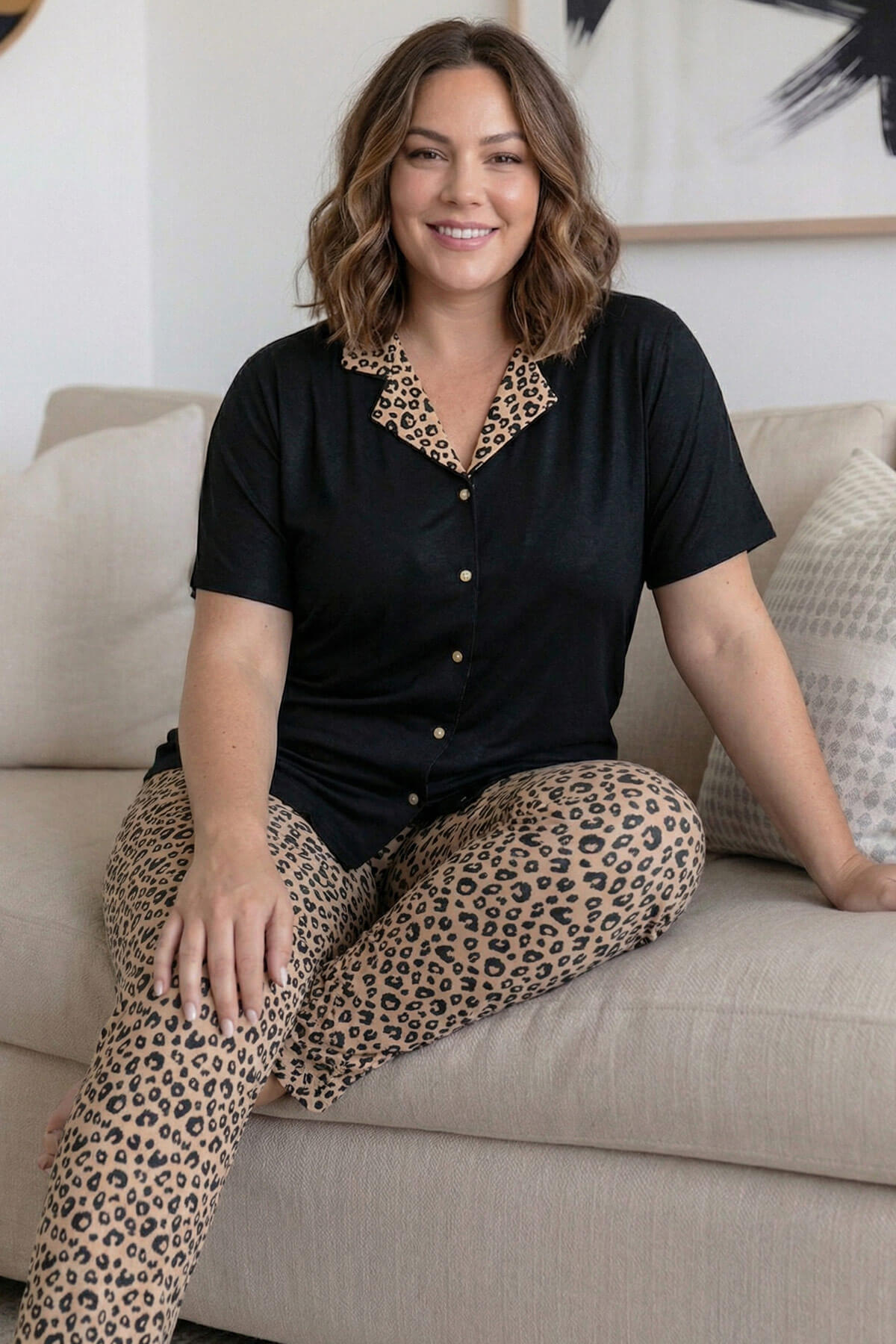 | Siyah Leopar Desenli Büyük Beden Kısa Kollu Önden Düğmeli Bambu Kadın Pijama Takımı | |