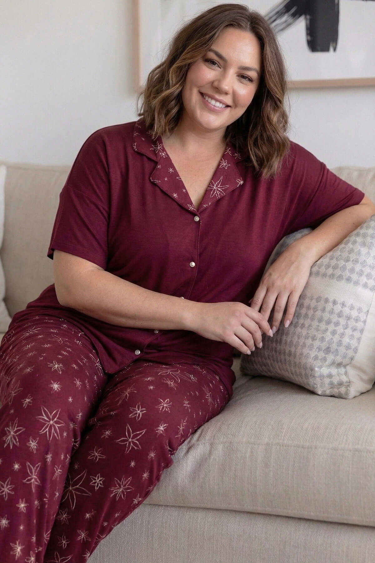| Bordo Papatya Desenli Büyük Beden Kısa Kollu Önden Düğmeli Bambu Kadın Pijama Takımı | |