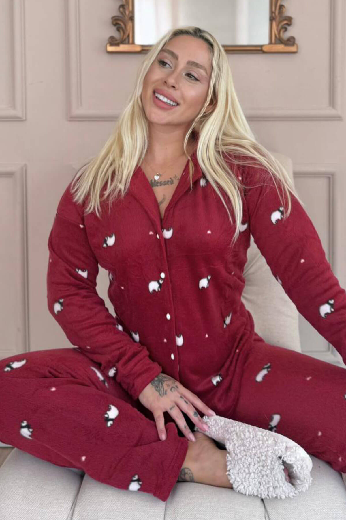 | Bordo Panda Desenli Önden Düğmeli Peluş Polar Pijama Takımı | |