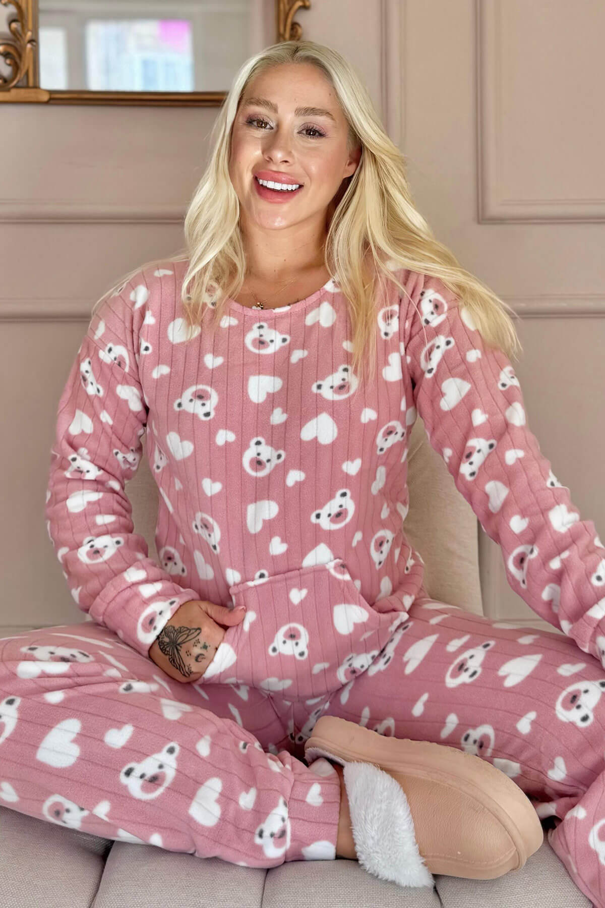 | Pembe Heart Bear Desenli Kanguru Cepli Peluş Polar Pijama Takımı | |