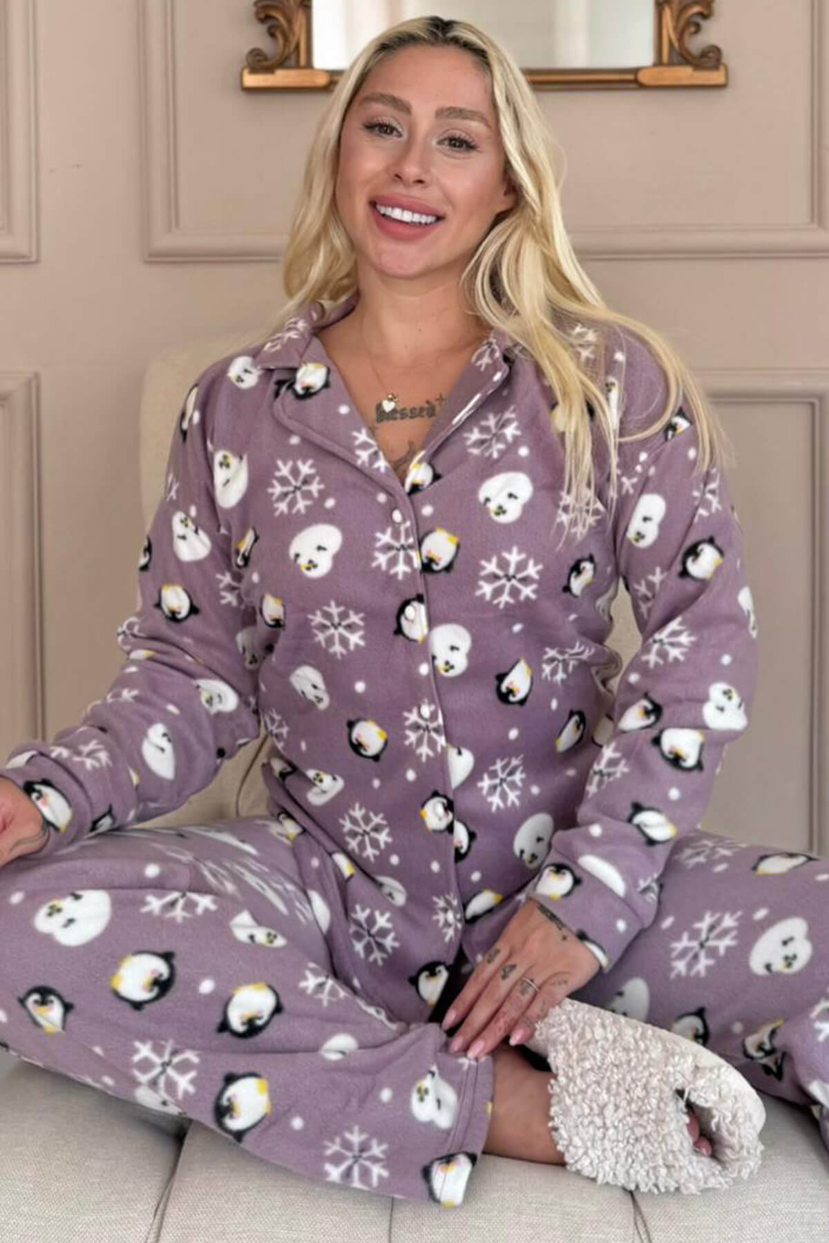 | Lila Penguen Desenli Önden Düğmeli Peluş Polar Pijama Takımı | |