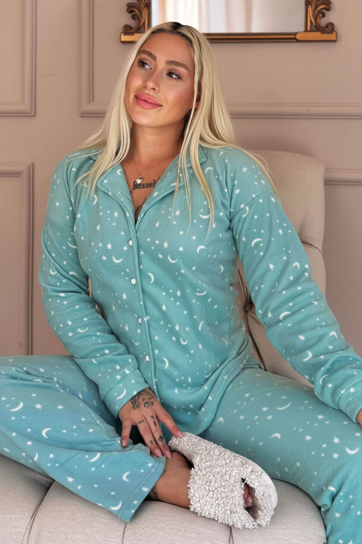 | Mint Moon Stars Desenli Önden Düğmeli Peluş Polar Pijama Takımı | |