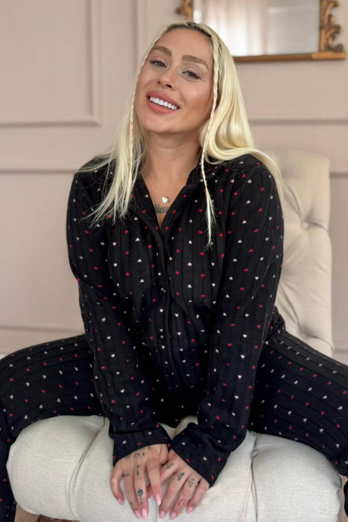 | Siyah Jantung Desenli Önden Düğmeli Peluş Polar Pijama Takımı | |
