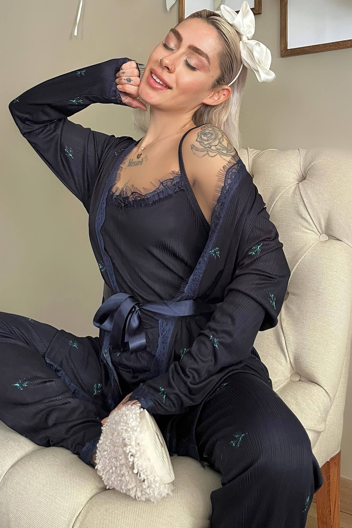 | Lacivert Leaf Desenli Sabahlıklı Pegasus Pijama Takımı | |