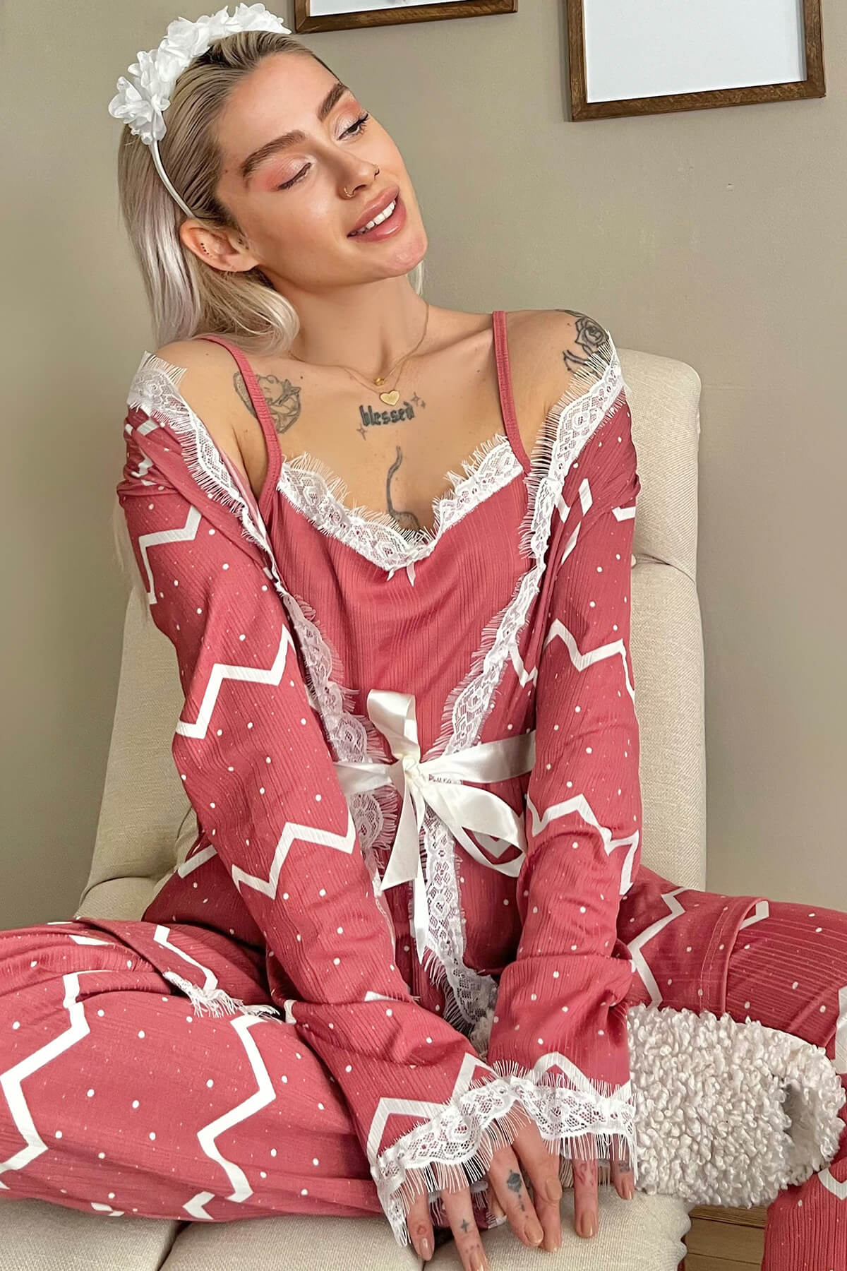 | Kırmızı Piti Kare Desenli Bambu Sabahlıklı Kadın Pijama Takımı | |