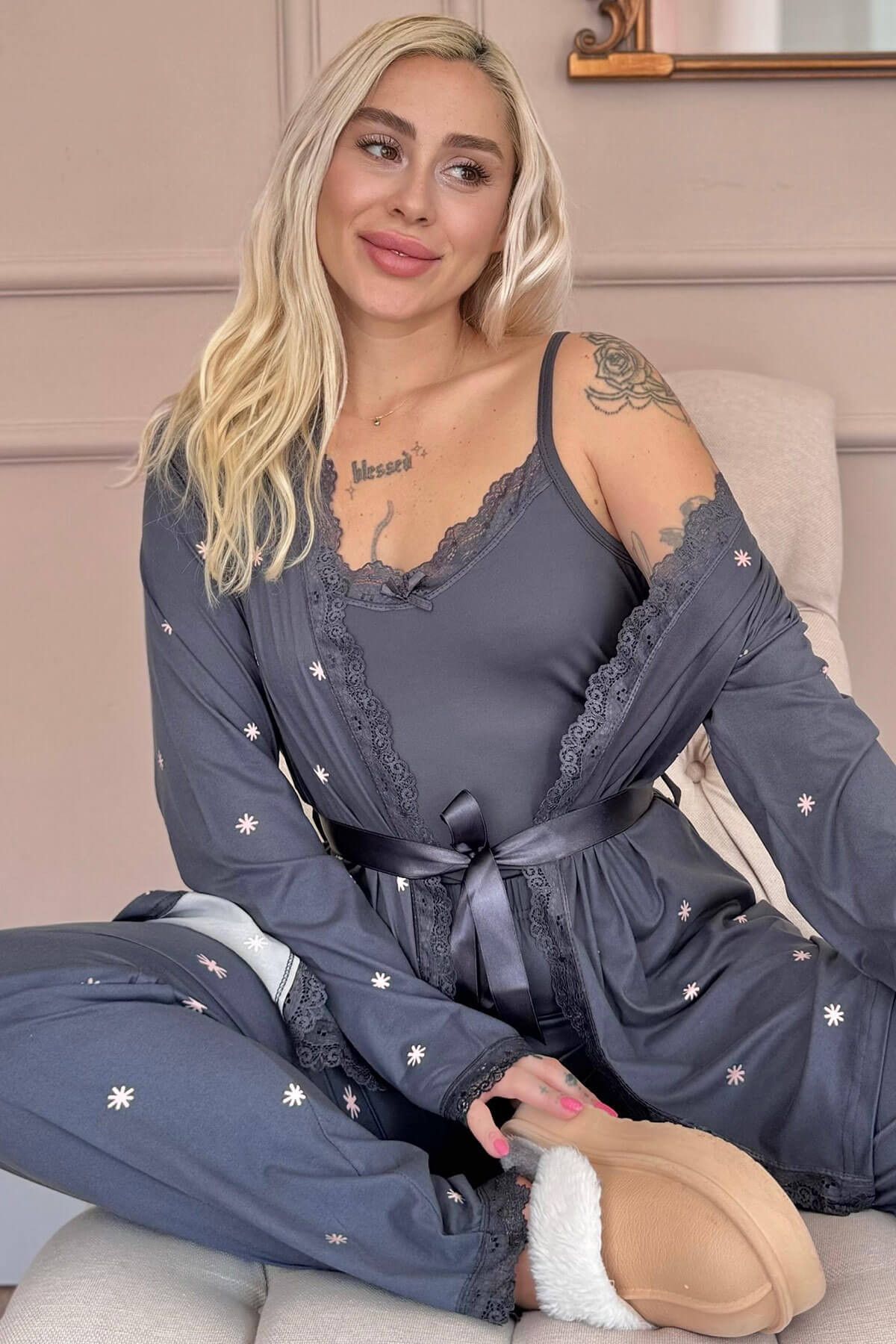 | Antrasit Sunlit Desenli Bambu Sabahlıklı Kadın Pijama Takımı | |