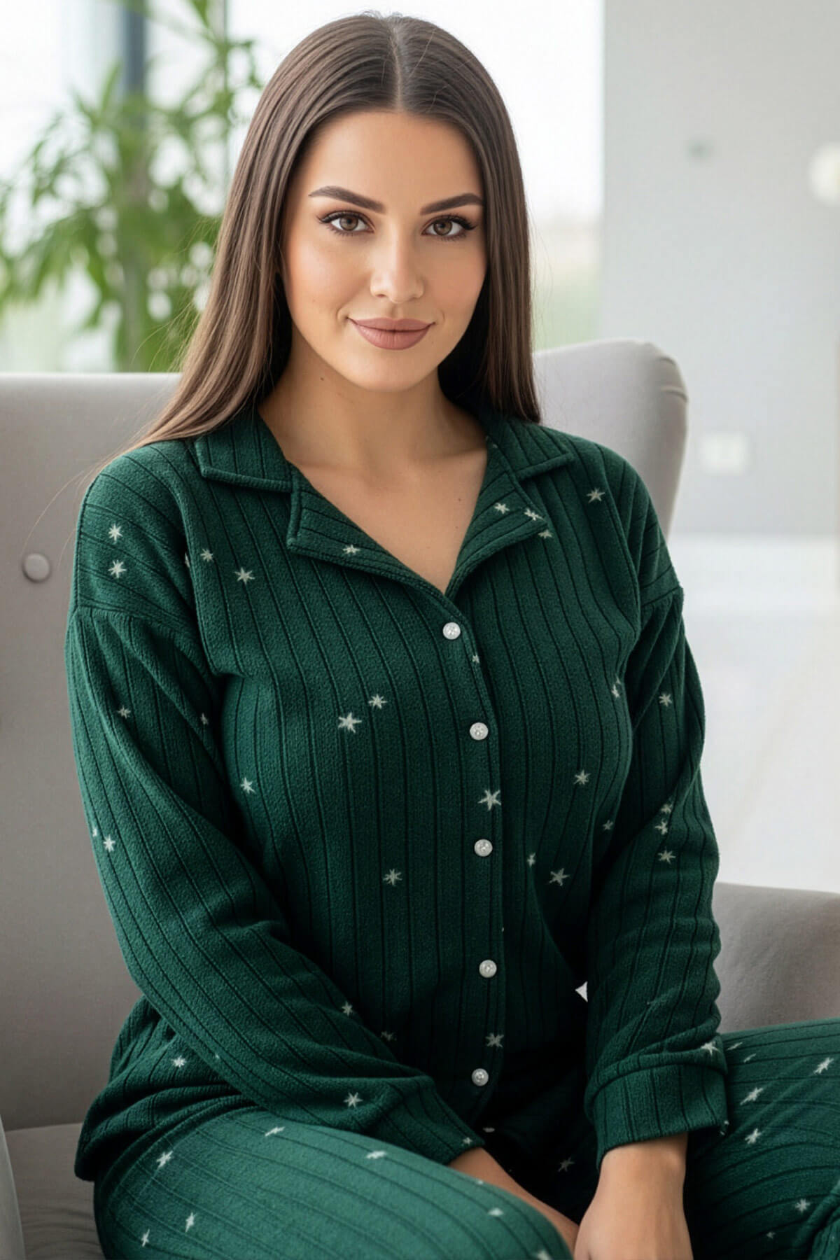 | Yeşil Yıldız Desenli Önden Düğmeli Peluş Polar Pijama Takımı | |