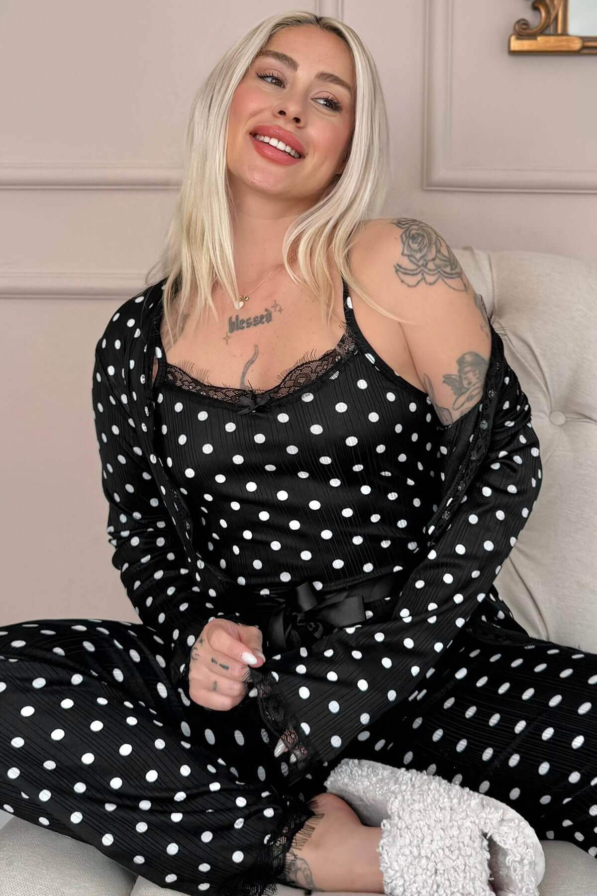 | Siyah Beyaz Puantiye Desenli Sabahlıklı Pegasus Pijama Takımı | |