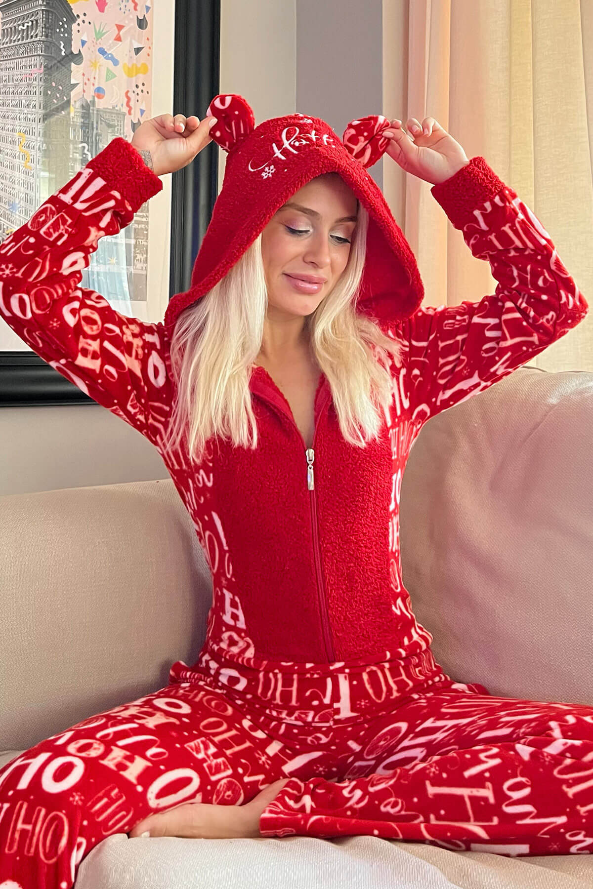 | Kırmızı Laugh Desenli Kadın Polar Peluş Tulum Pijama Takımı | |