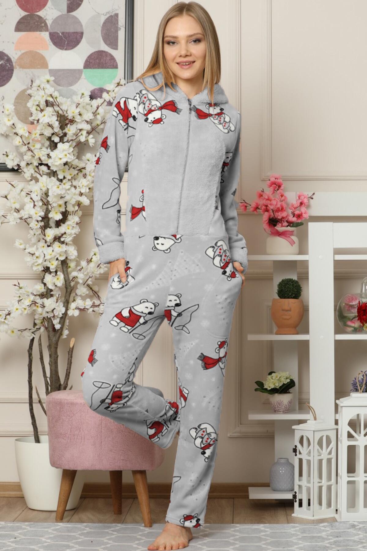 | Gri Bear Desenli Kadın Polar Peluş Tulum Pijama Takımı | |
