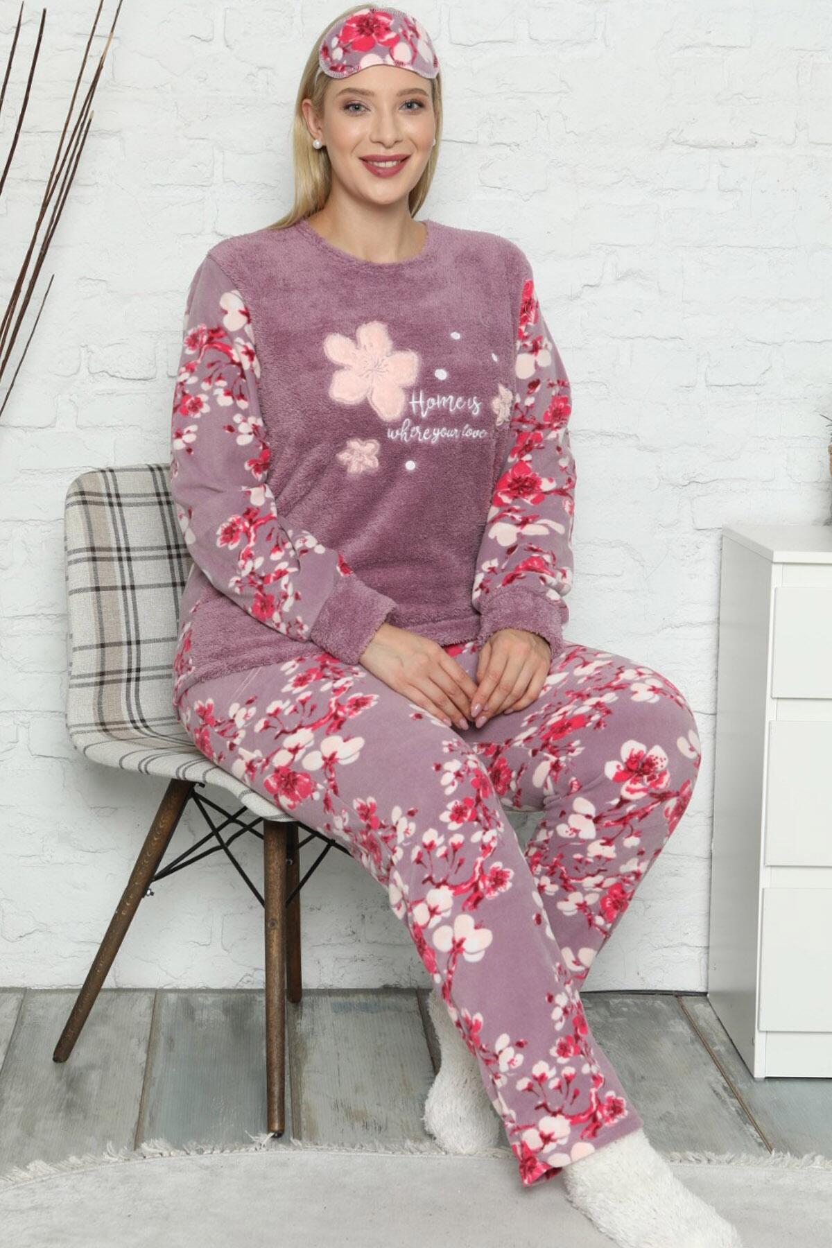 | Mor Yaprak Desenli Kadın Peluş Pijama Takımı | |