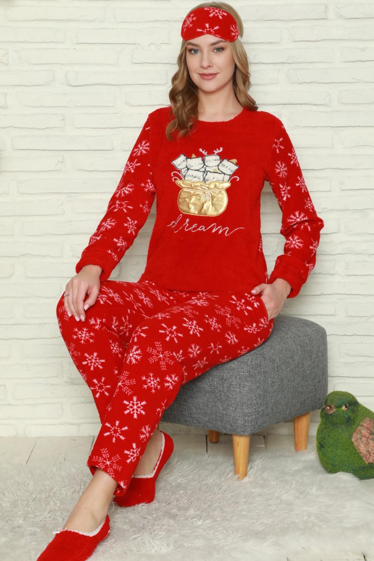 | Kırmızı Hello Winter Desenli Kadın Peluş Pijama Takımı | |