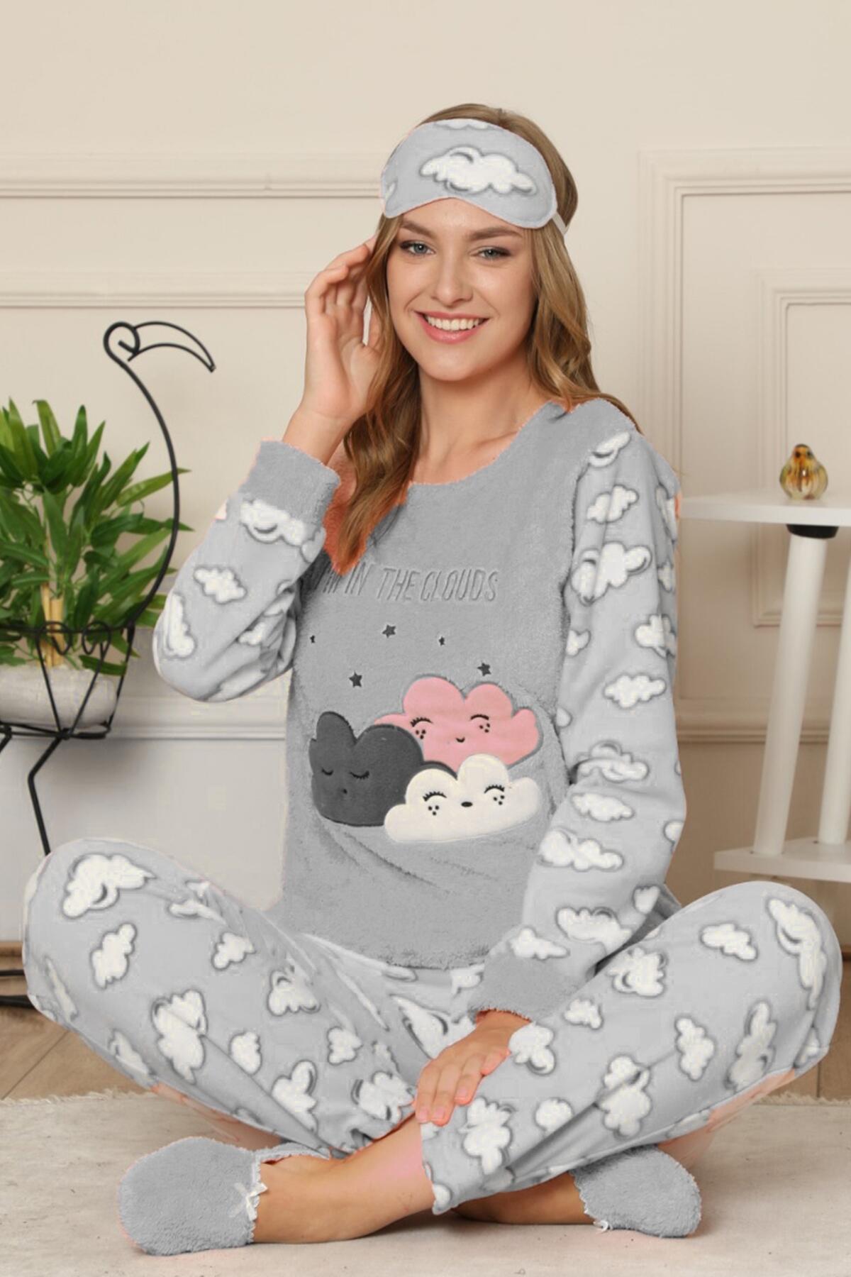 | Gri Bulut Desenli Kadın Peluş Pijama Takımı | |