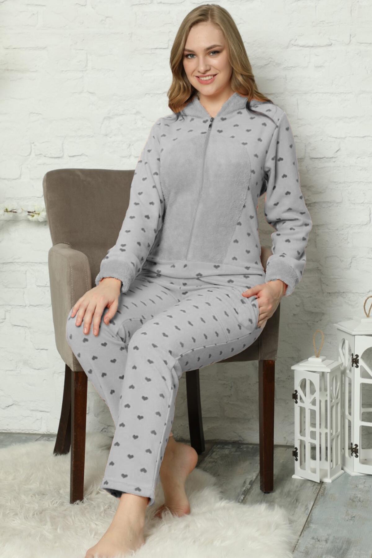 | Gri Kalp Desenli Kadın Polar Peluş Tulum Pijama Takımı | |