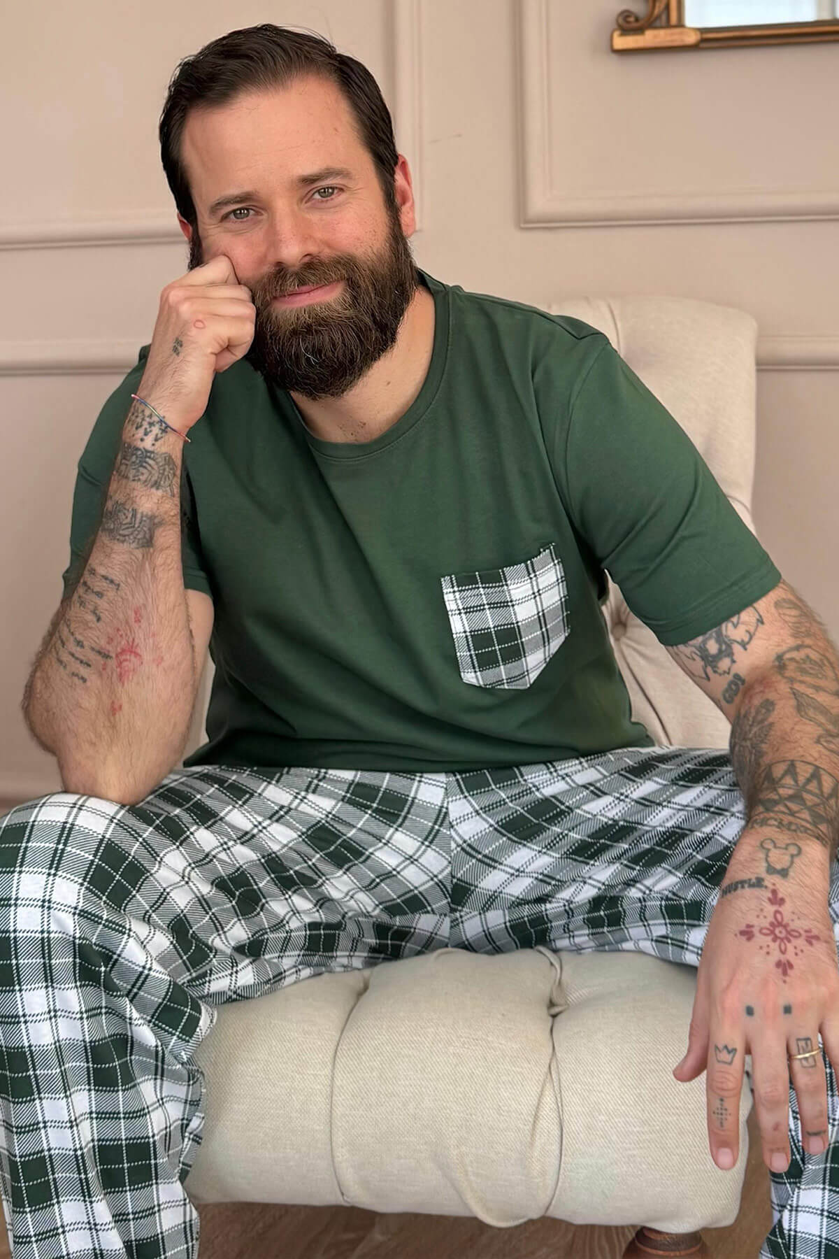 | Haki Siyah Ekose Cep Detay Kısa Kollu Erkek Pijama Takımı | |
