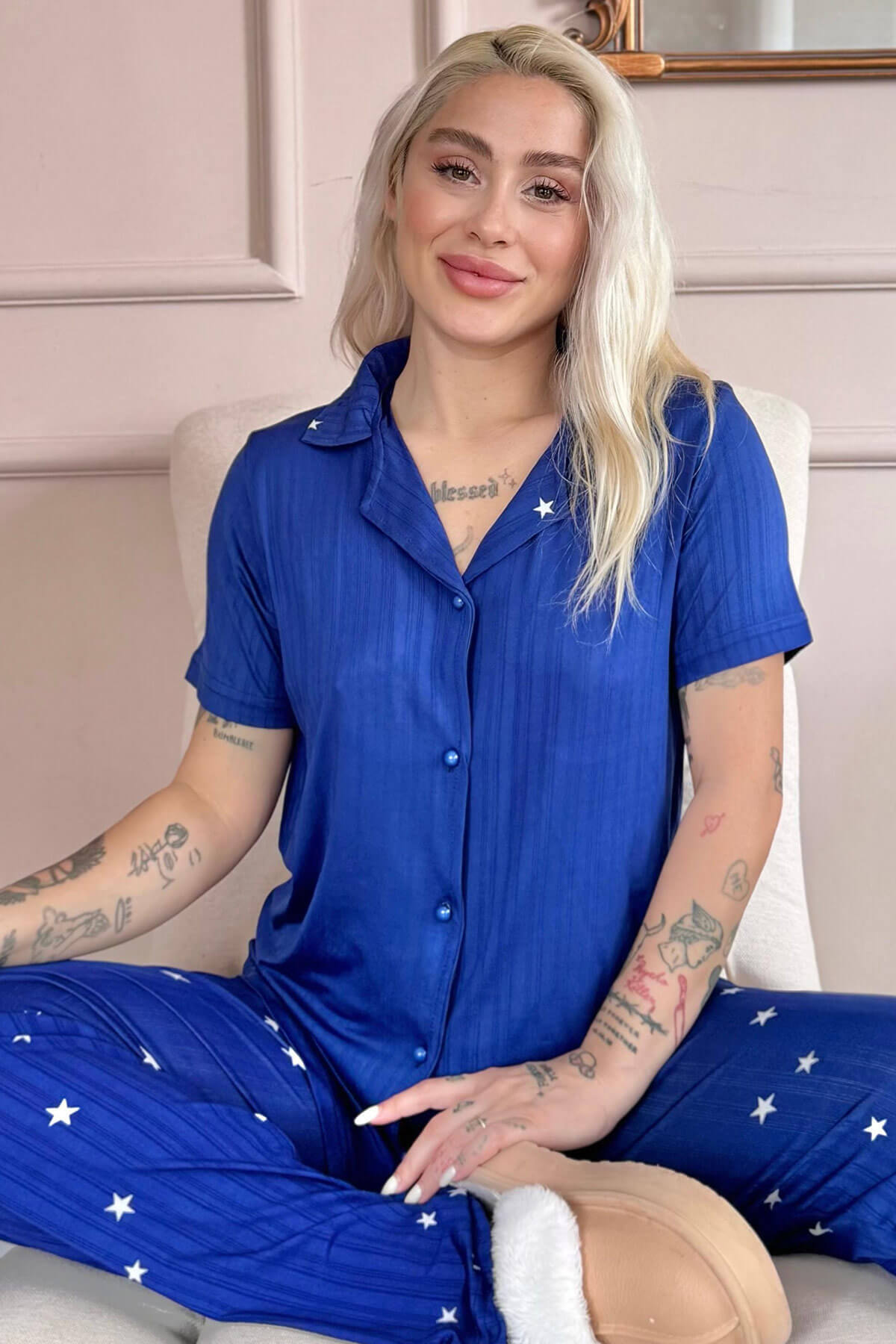 | Pudra Stars Desenli Bambu Önden Düğmeli Uzun Kol Kadın Pijama Takımı | |