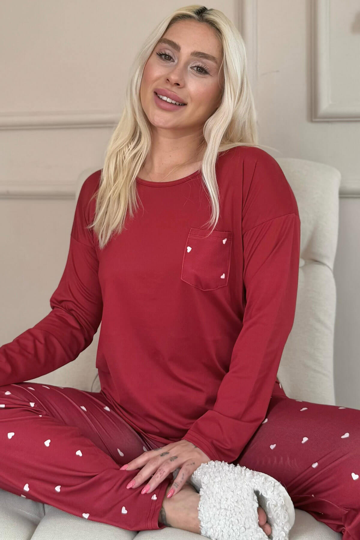 | Bordo Kalp Desenli Bambu Uzun Kol Kadın Pijama Takımı | |