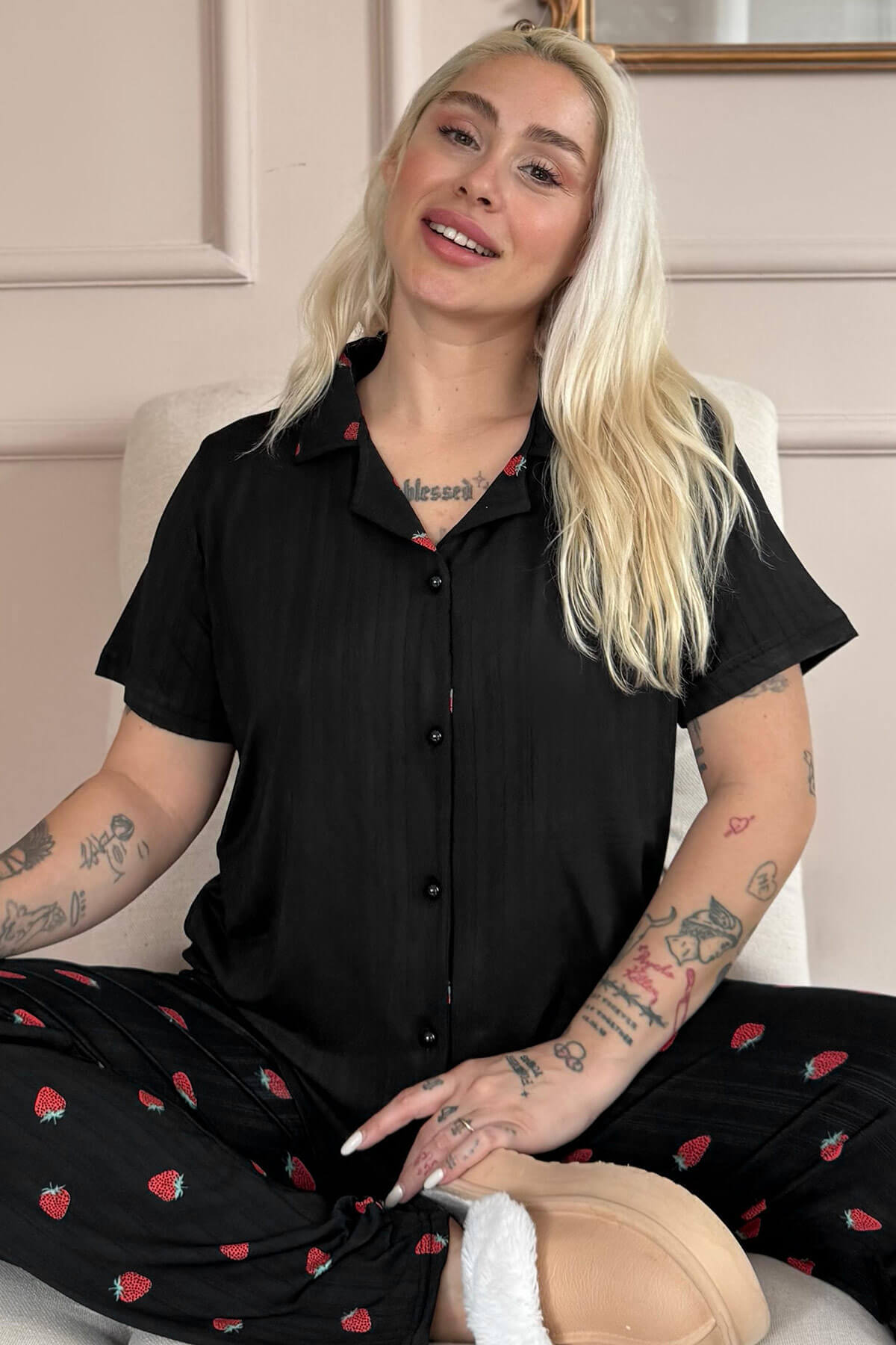 | Siyah Noir Fraise Desenli Önden Düğmeli Marlenka Pijama Takımı | |