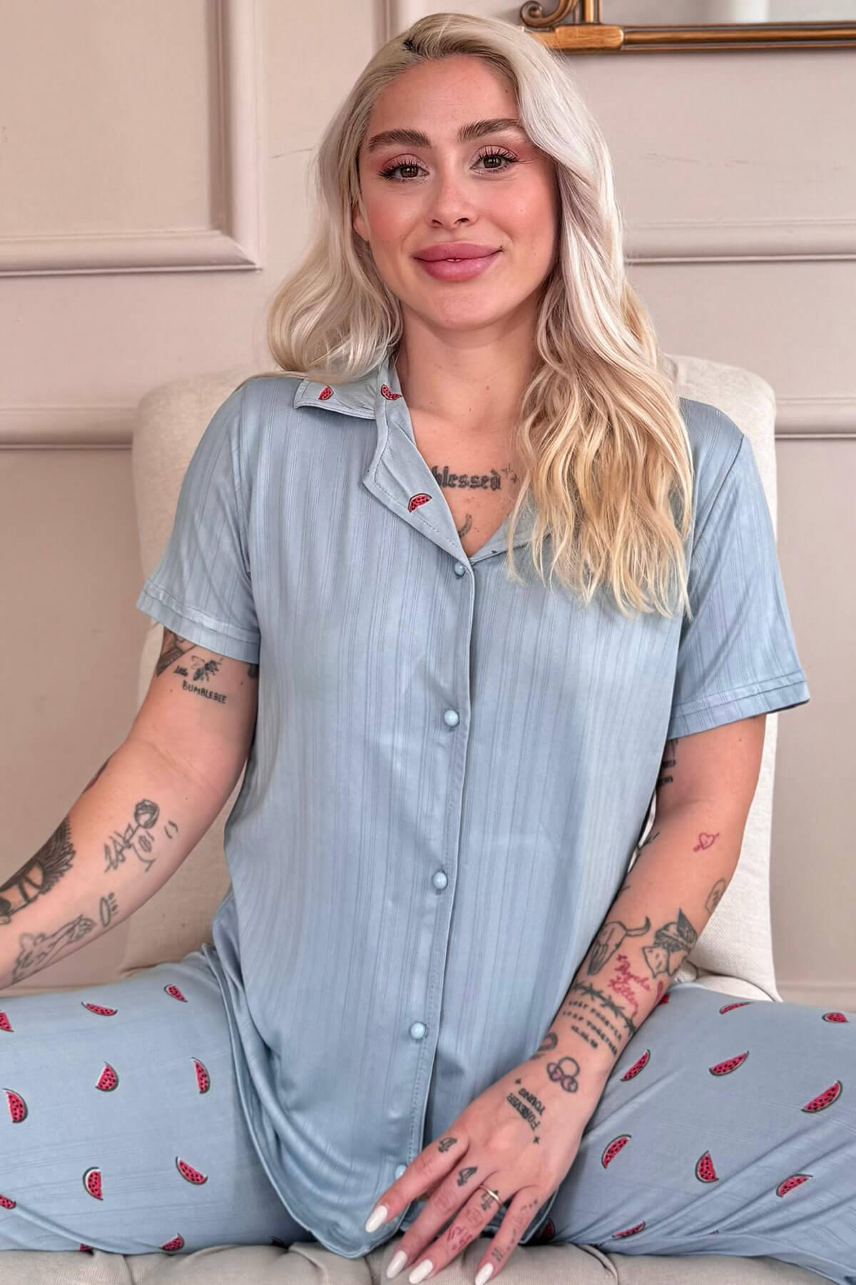 | Aqua Melon Bliss Desenli Önden Düğmeli Marlenka Pijama Takımı | |